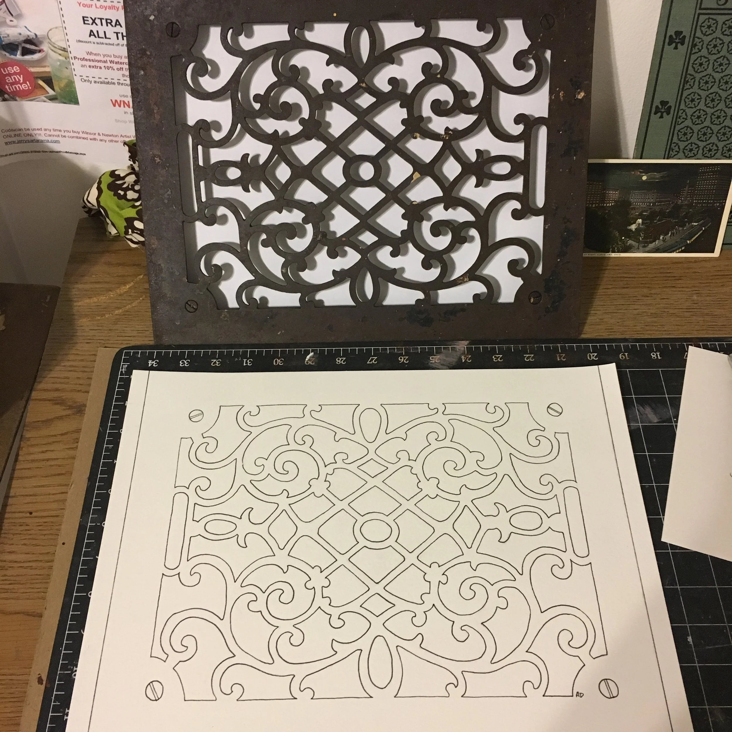 Register Grate, 19” x 23” x 1”, watercolor, acrylic paint, and pen on foamboard and watercolor paper